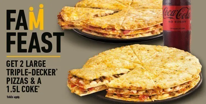 Get 2 large (30 cm) Triple-Decker pizzas and 1.5L Coke