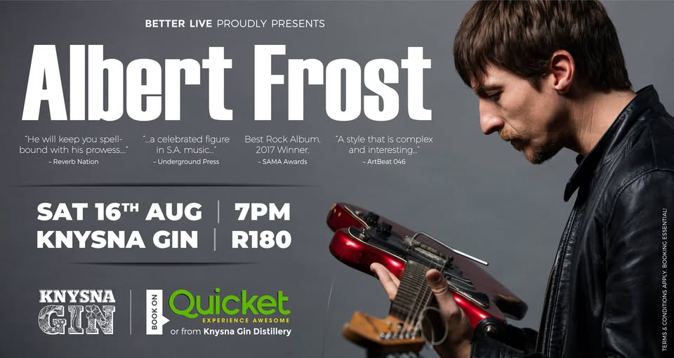 Join us for an unforgettable evening with legendary South African blues-rock guitarist Albert Frost, live at Knysna Gin! Known for his electrifying performances and masterful guitar work, Albert will take you on a musical journey filled with soulful blues, rock energy, and captivating storytelling.
