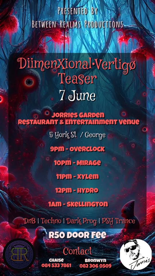 Between Realms Productions invites all Garden Route movers and groovers to our get to know the team event on Saturday the 7th of June with some Drum and Bass , Techno, Prog , and Trance