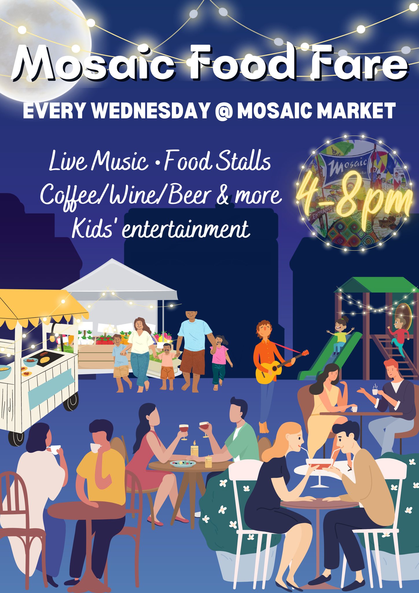 The Mosaic Village & Outdoor Market is very proud and excited to present the MOSAIC FOOD FARE! It will be held every Wednesday evening from 4pm-8pm. Come and join us for this very special evening with family and friends under our big palm tree. Take a midweek break and enjoy our lovely venue with an amazing atmosphere and have some good food, something to drink, and enjoying some live music!