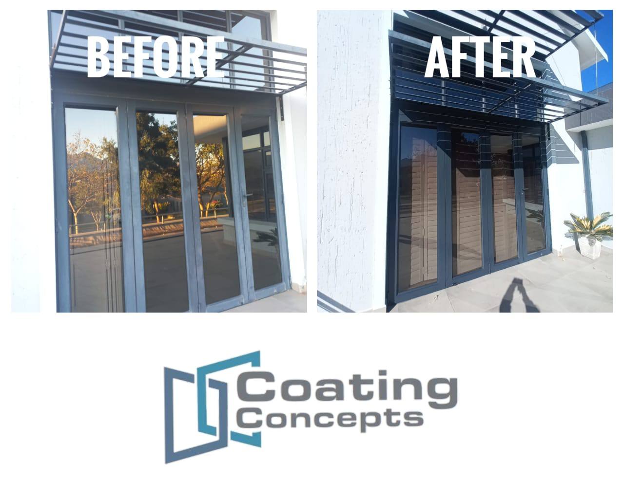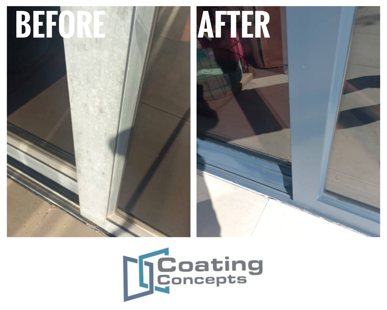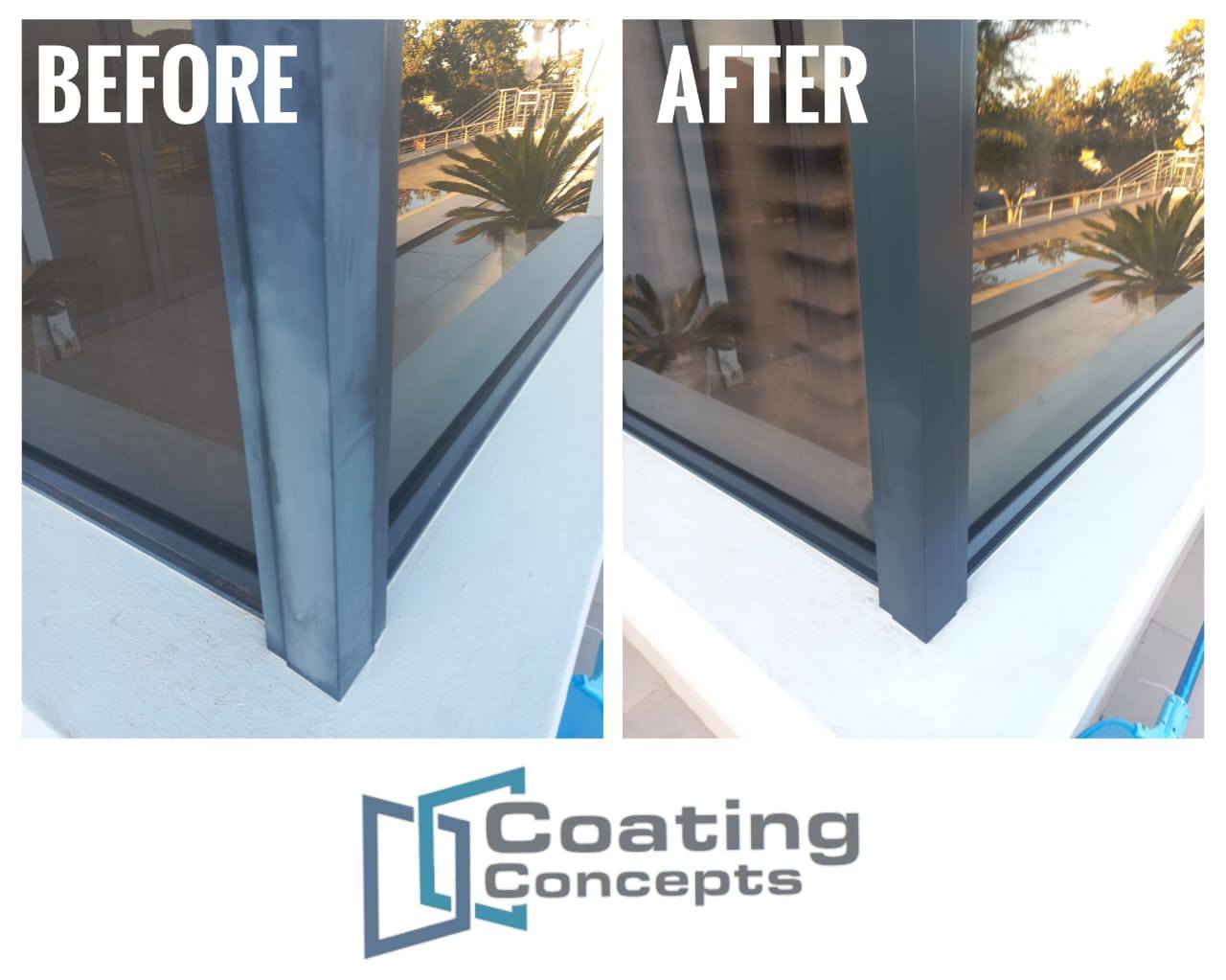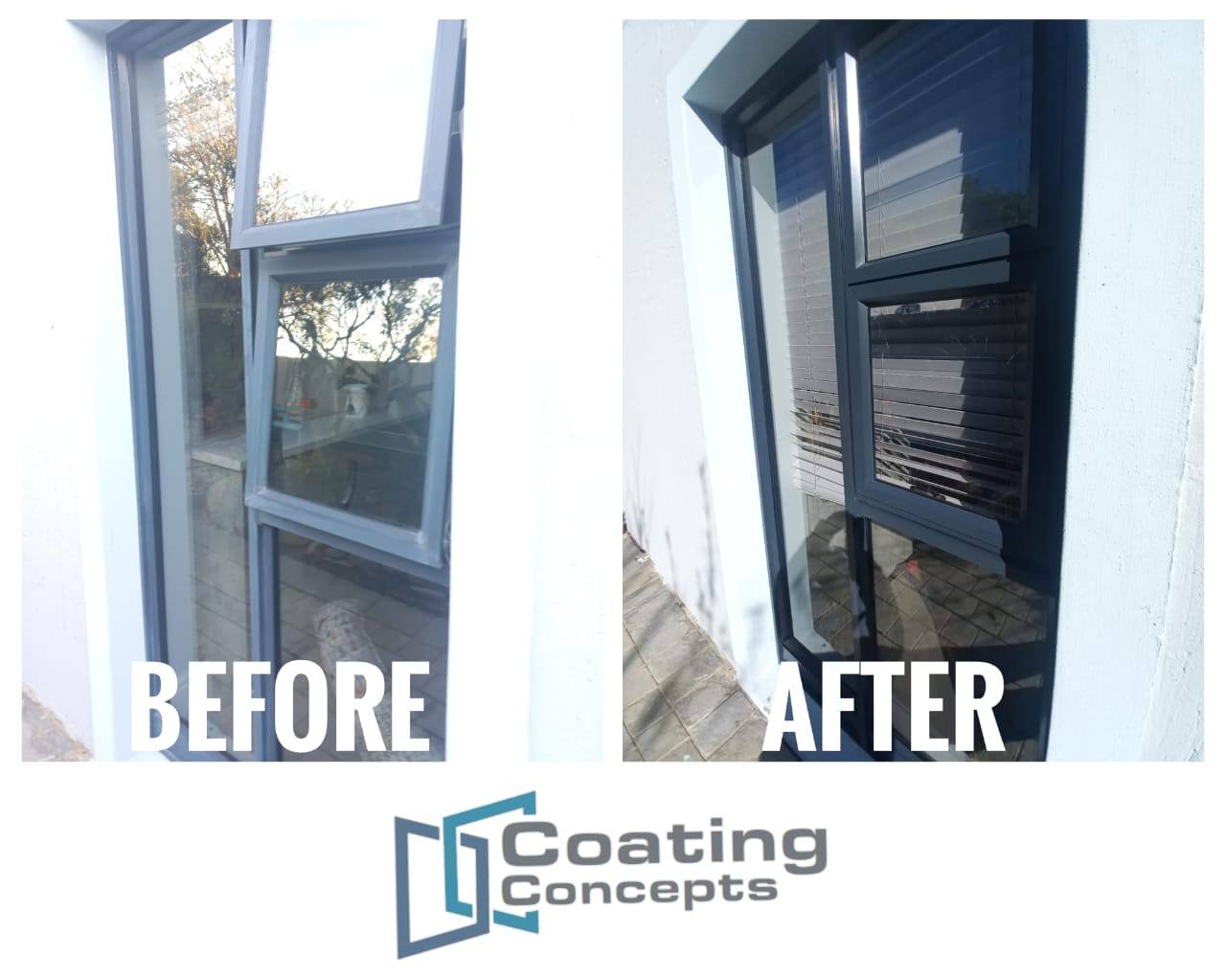 Aluminium colour restoration – Powder coated and anodized aluminium fades and corrodes due to UV damage, coating concepts reverse the damage and protects aluminium on site. We bring back life to faded aluminium!