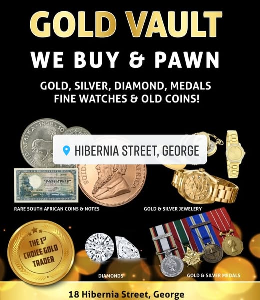 Gold Vault in George – We buy, sell and pawn gold, silver, Diamonds, Medals, Fine Watches & Old Coins and we give the Best Prices Guaranteed on Kruger Rands. We Also sell bulk Silver Bullion in different sizes.