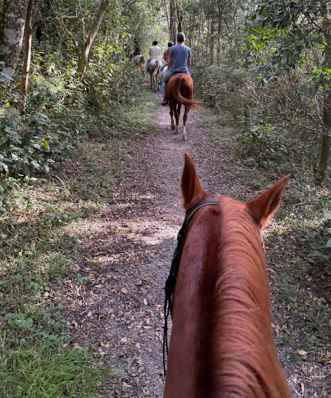 When planning a trip like this, it would be advised to wear long pants to protect legs from chafing against the saddle, and close-toed shoes with a small heel to keep feet from slipping out of the stirrups. Avoid all clothing that could get tangled in equipment including scarves, thin tank top straps, and long, loose sweaters or shirts.